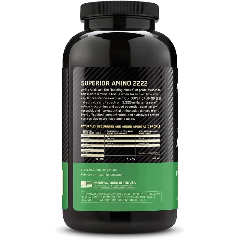 Optimum Nutrition Superior Amino 2222 320 count tablets. Over 2 grams of total aminos. Provides 18 different types of amino acids. Free-form L-carnitine and L-ornithine.