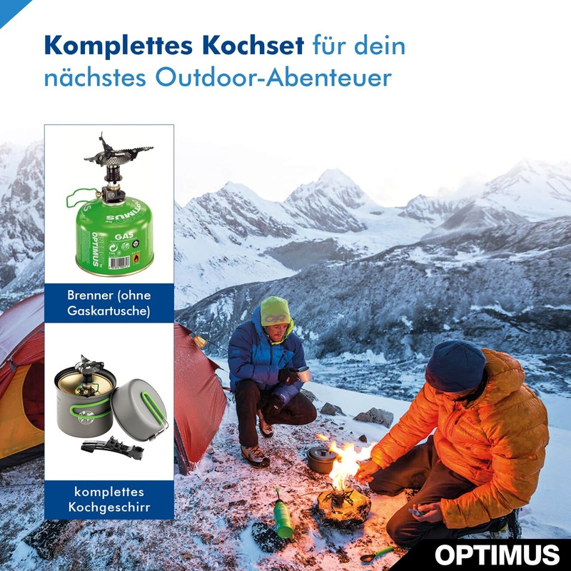 - Efficient 3-piece cooking system consisting of Optimus Crux gas stove and the Terra Weekend HE cooking set