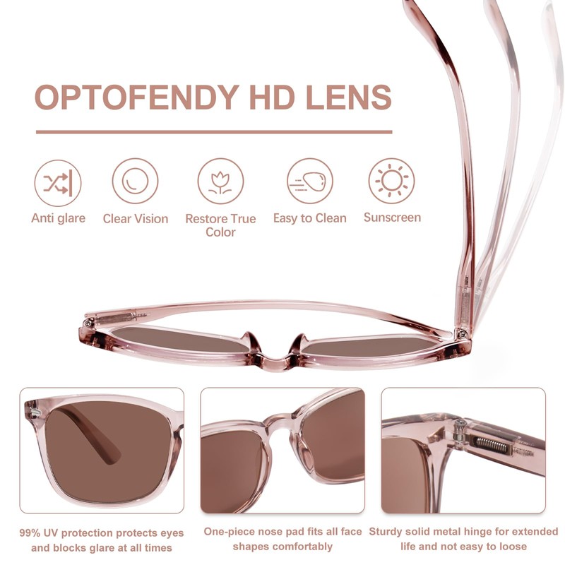 - DOUBLE GAURD - Get the appropriate magnification required for reading with OPTOFENDY reader sunglasses women. OPTOFENDY sunglasses for women feature HD lenses that filter the glare reflected from sunlight and block 99% of harmful UVA and UVB rays to protect your eyes from long-term damage and provide you with maximum clarity and color while you enjoy the sun.