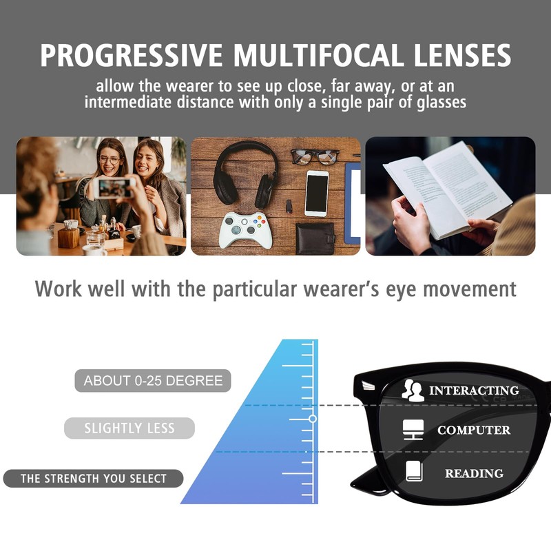 - NO MORE SWITCHING GLASSES - See near and far with Progressives. Wear your sunglasses with readers "all day" without taking them off. Progressive lenses offer seamless, line-free transitions across near, intermediate, and distance vision zones. They will help you see clearly at all distances without those annoying "bifocal lines", and give you a more youthful appearance than bifocals.