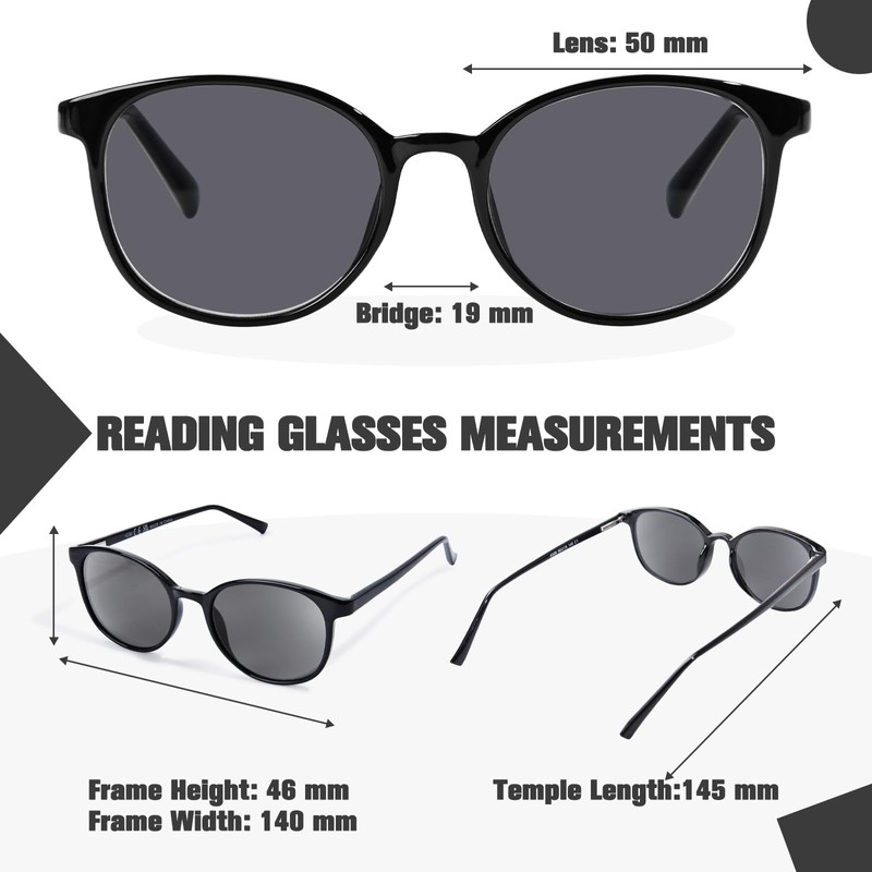 - EASY MATCHING - The brief round frame without any complicated ornaments shows delicacy and elegance. TR90 frame arms with spring hinges fit medium and large faces in comfort and style. These sunglasses with readers will be your everyday glasses in all seasons. Wonderfully versatile - can be matched with your daily wearing.