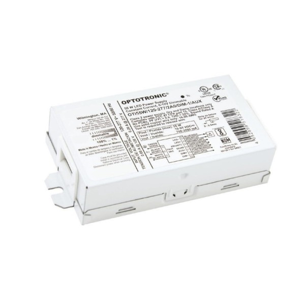 The OPTOTRONIC OTi 55W 120-277 indoor compact programmable LED drivers are exclusive to North America. All of these highly efficient constant current drivers dim to 1% with unique architectural grade features—such as Dim to Off, Vaux Output and Synchronized ON/OFF Timing—to meet the tough demands of your lighting projects. Our 55W compact LED drivers’ programmable output current range (700-2000mA)—coupled with their universal input voltage range (120-277V)—provides you with a highly efficient and flexible drive solution for indoor lighting. Perfect for downlights, in-grade fixtures, recessed troffer and wall wash lighting for your office and retail applications.Features: