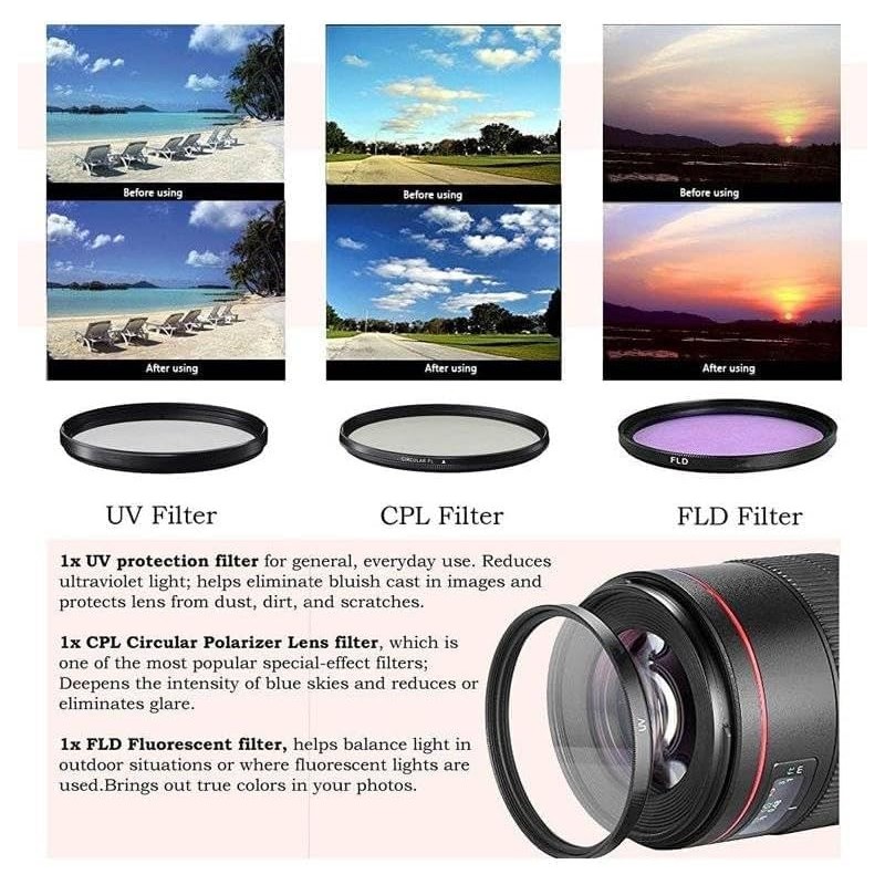 - FLD filter helps balance light in outdoor situations/UV filter absorbs ultraviolet rays to produce crisp/Circular Polarizing filter eliminates reflections from non-metallic surfaces