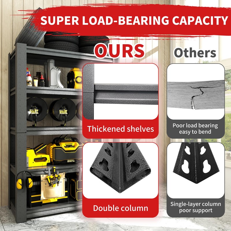 - 【RUST-PROOF, SCRATCH-PROOF, EASY-TO-CLEAN HEAVY DUTY SHELF】 This heavy duty 5 tier shelving unit storage shelves are phosphated and has a high-quality, premium powder-coated appearance, with rounded edges, it won't be susceptible to moisture and mildew like MDF, and it's not easy to be scratched, and at the same time it's exceptionally easy to clean, if you need a basement storage shelves/utility shelves for storage, this steel metal shelving unit is the best choice for you.