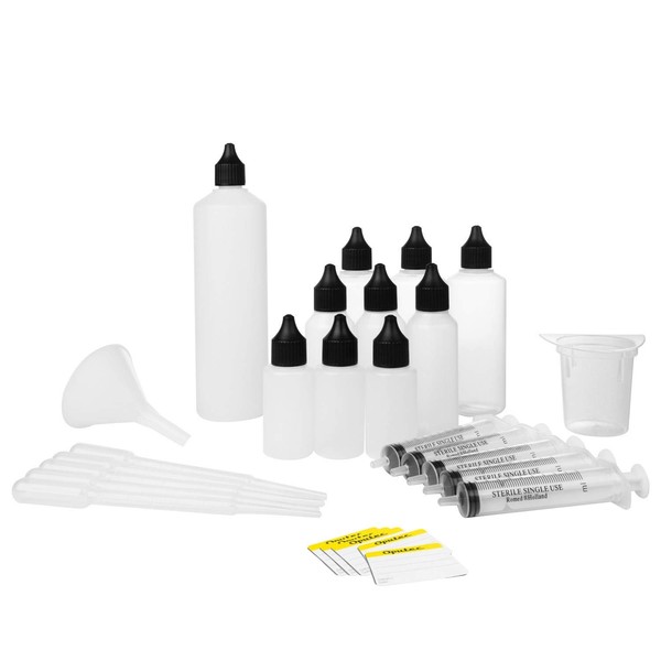 - Giant set contents: 3 x 30 ml bottles, 3 x 50 ml bottles, 3 x 100 ml bottles, 1 x 250 ml bottle, 1 x 50 ml measuring cup, 1 x funnel, 5 x 10 ml syringe, 5 x 3 ml pipette, 10 x writable labels