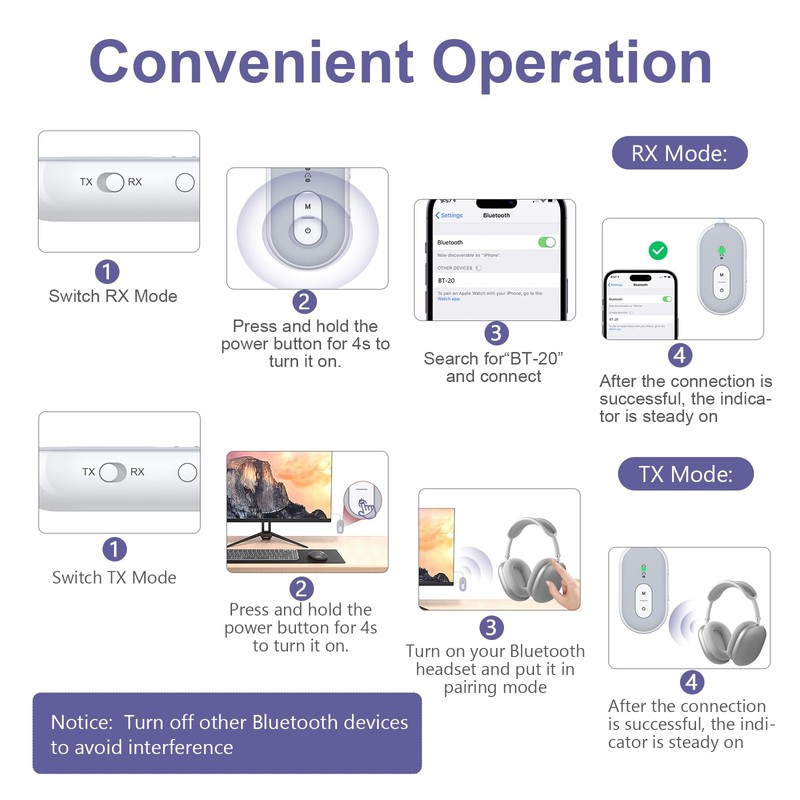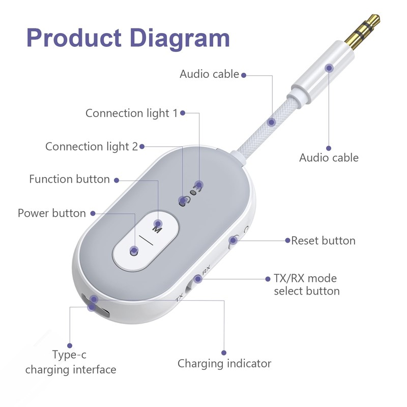 Bluetooth transmitter and receiver, TX mode can be used for desktop computers, TVs, game consoles, treadmills, aeroplanes and other devices; RX mode can be used for old-fashioned stereos, amplifiers, car radios and other device