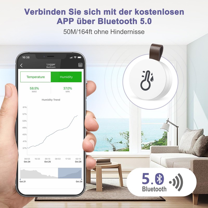 - Stable and efficient wireless connection: Our temperature and humidity sensor has a high-quality Bluetooth 5.0 chip, which ensures a fast and stable connection over up to 50 metres, supports the simultaneous connection of several sensors and achieves extremely low latency times in data transmission.