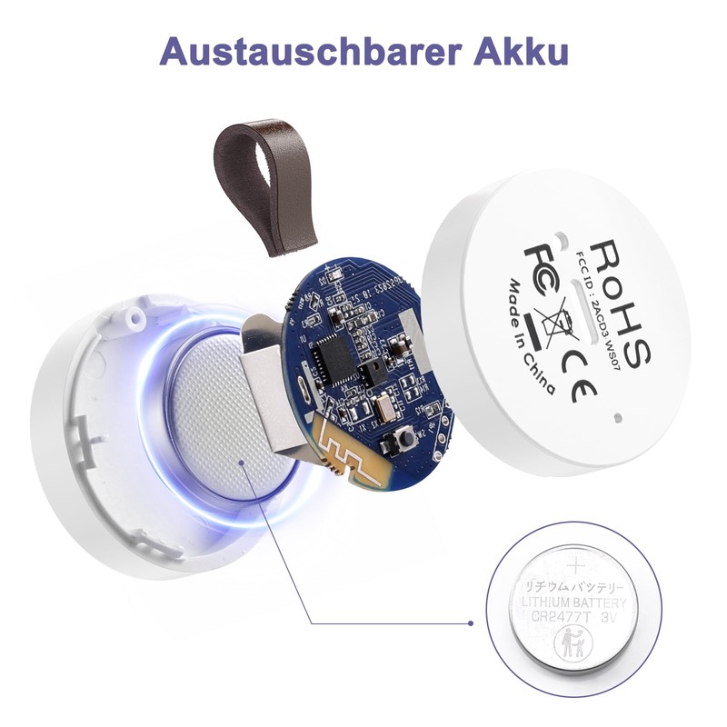 2. Small size and low power consumption, the product size is approx. 1.5 x 1.5 x 0.62 inches, and the battery can be replaced (CR2477).