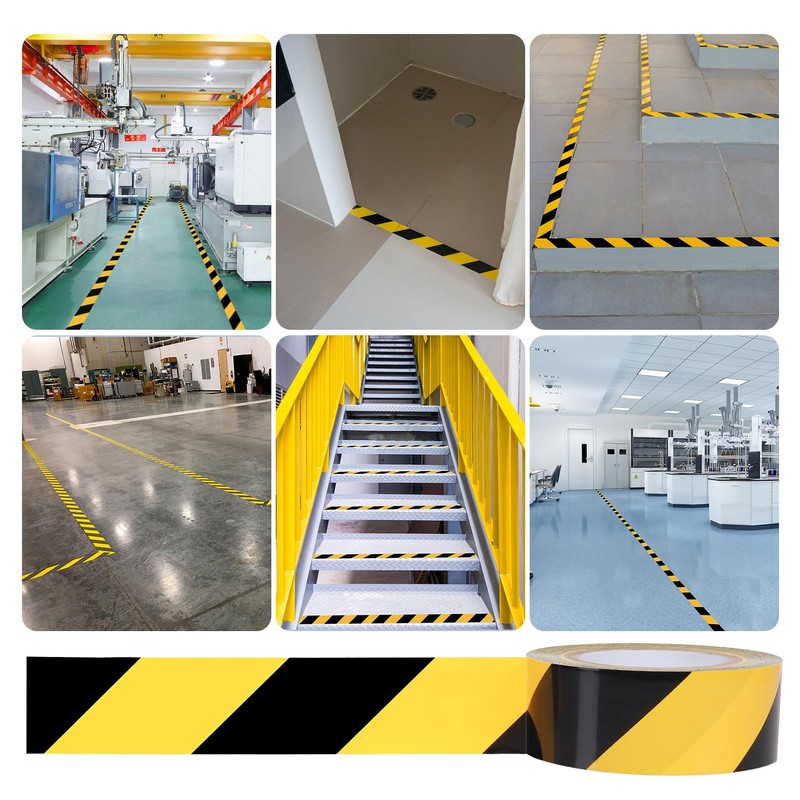 - The yellow and black stripes are highly visible and can be used to mark floors in industrial and manufacturing facilities. They can also be used to demarcate floor edges, mark parking spaces, demarcate rooms, etc.