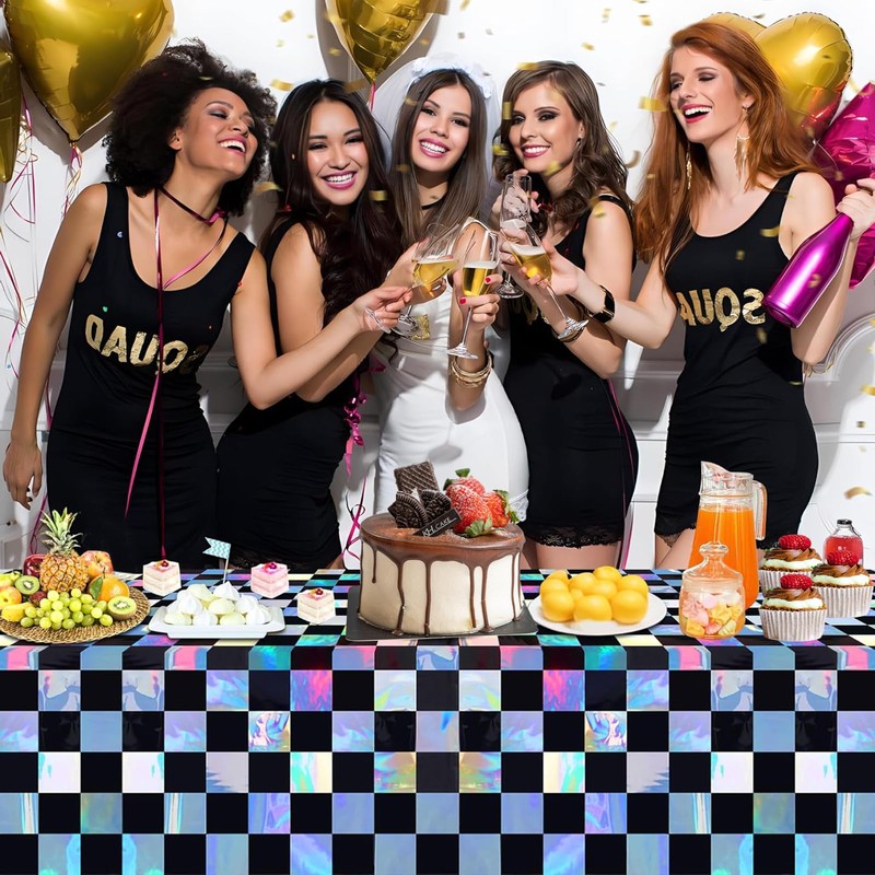 Package Include: You will get 2 pieces black and silver checkered iridescent plastic disposable tablecloths. Each size is 54" x 108" (137 x 274 cm), which fits most rectangular tables. They can protect your table from being scratched and dirty, and they can be recycled after wiping cleanIridescent Design: Our party tablecloth features a shiny iridescent design and displays stunning colors, making it an ideal centerpiece for your party, the bright colors will add a special touch to your partyDurable Material: The glossy tablecloth is made of OPP material, durable, waterproof, oilproof, dustproof, non-toxic and odorless, environmentally friendly, safe. The printing color of the party table cover is brilliant and not easily to fadeConvenient and Practical: The shiny birthday decorations kit is a nice choice to decorate your shiny laser theme party. Using these disposable tablecloths will save you time and energy and you can throw them away after the party, allowing you to spend more time with your guests Wide Use: Our iridescent party table decorations are suitable for iridescent-themed parties, baby showers, laser-themed parties, 60s 70s 80s 90s birthday parties, bachelorette parties, disco party, wedding parties, shining theme parties, festivals, daily gathering.