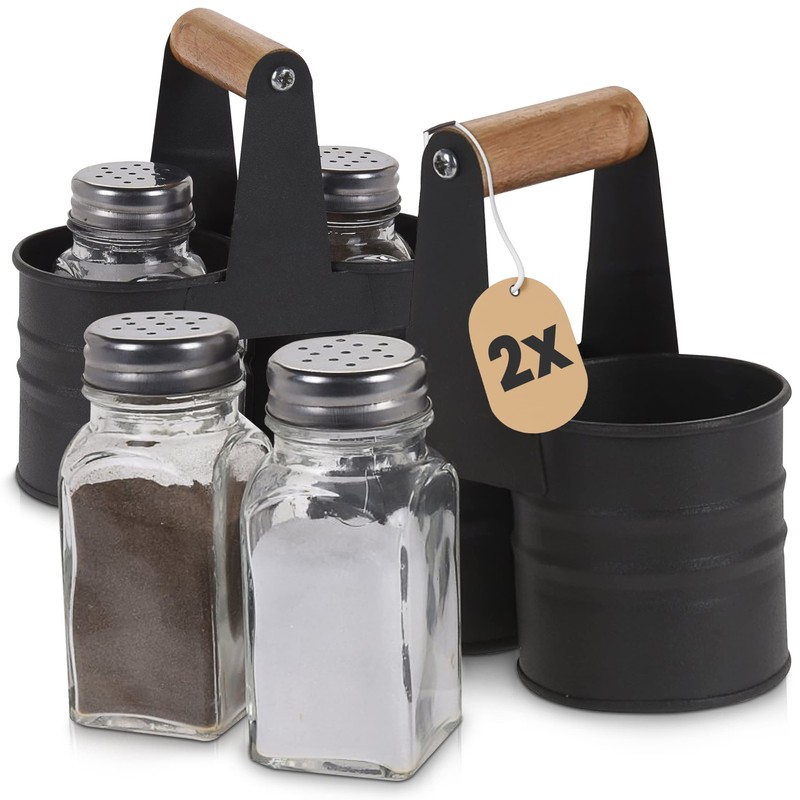 Oramics Set of 2 Pepper and Salt Shakers with Holder with Carry Handle, Ideal for Household and Catering, Set Consists of 2 Pepper Shakers, 2 Salt Shakers and 2 Holders with Handle