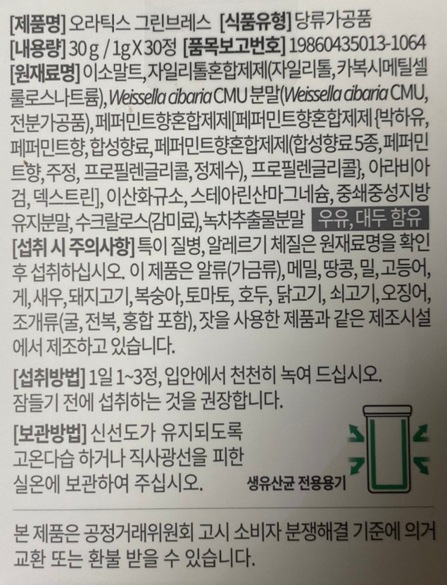 오라팜 오라틱스 그린브레스구강유산균 1000mg x 30정