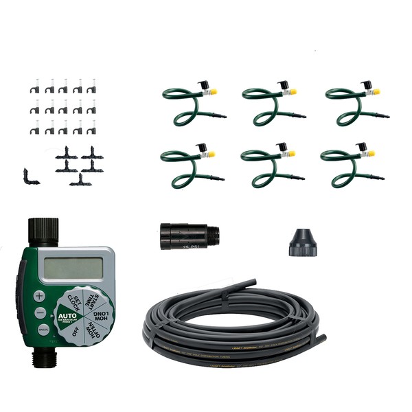 The Orbit Hanging Basket Watering Kit includes everything you need to simply and efficiently water your hanging baskets from a hose faucet or garden hose. The flexible memory tube wraps around the supports, positioning the sprinkler exactly. Kit includes: 50-ft of 1/4-in distribution tubing, 6 flex-mist sprayers, 15 tubing straps, 25 psi pressure reducer, tubing adapter, 5 barbed tees, tubing elbow and one-outlet digital hose faucet timer. The timer features a multitude of programming, allowing you to set it and forget it, taking the work out of watering your plants.