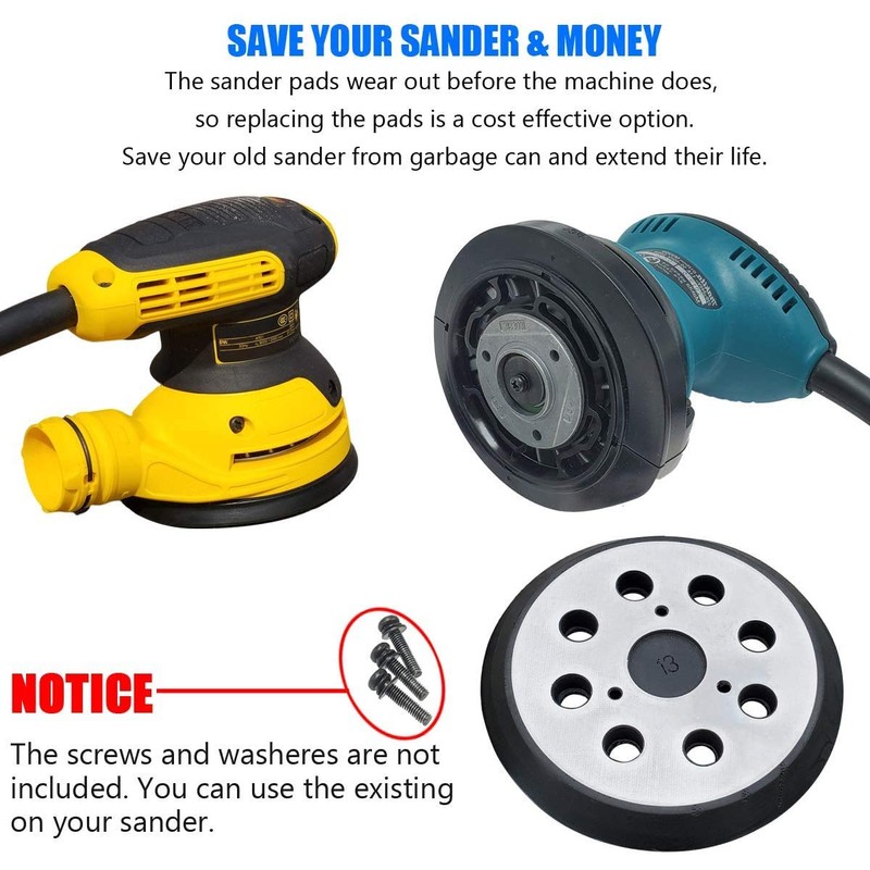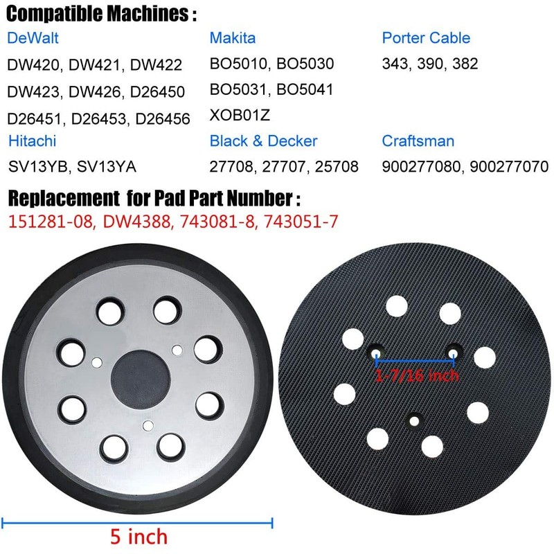 - 【Compatible Machines】: It's an universal sander pad that can replace the most common sander pad with 5" dia, 8 dust holes and 3 screw holes. It's compatible with DW420/K, DW421/K, DW422/K, DW423/K, DW426/K, D26450, D26451/K, D26453/K, D26456, Makita BO5030/K, XOB01Z, Porter Cable 343/343K/343VS/343VSK, 390K, 382, Black & Decker 27708, 27707, 25708, Craftsman 900277080, 900277070 and Hitachi SV13YB/YA random orbital sander.
