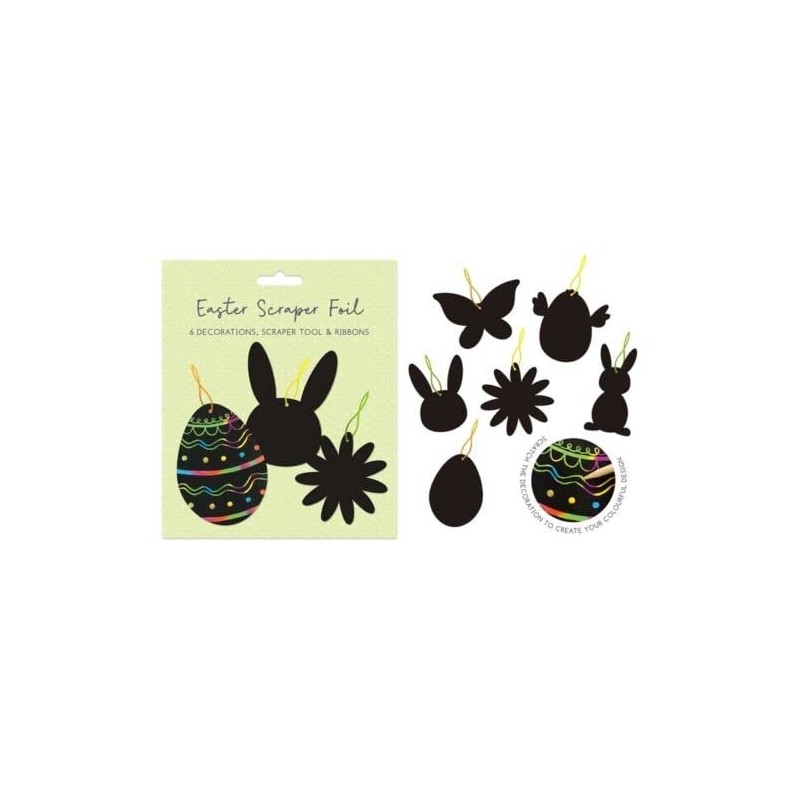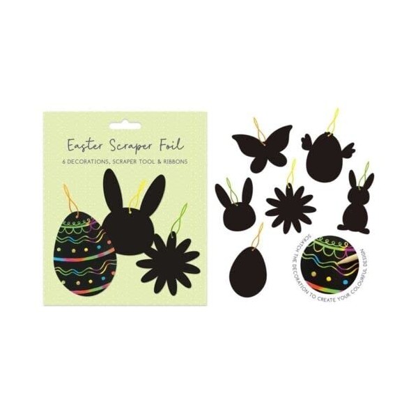 - Easter scratch art set of hanging decorations. Designs include Egg, Bunny, Rabbit, Chick, Flower and Butterfly