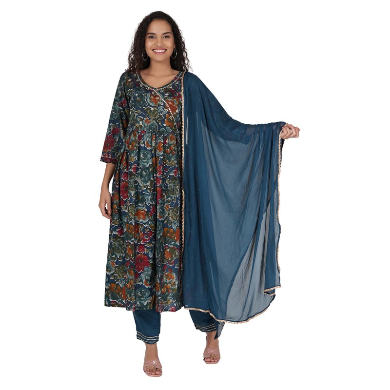 ORCHID BLOOM Green Floral Printed Muslin Suit Pant with Dupatta - X-Large