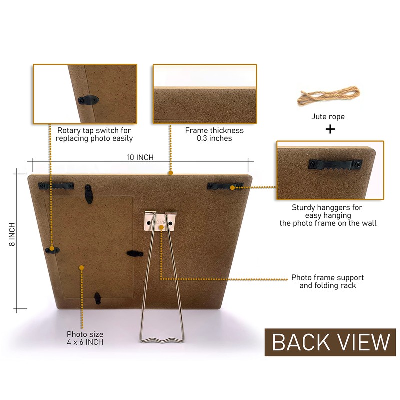 - Size: The frame measures 8"L x 10"W x 0.4"D and holds a 4" x 6" Photo.