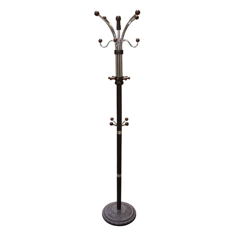 Ore International R685ESP 73"H Espresso Metal/Wood Coat Rack: Stay elegantly organized with this convenient wooden and metal coat rack. This rack features a total of sixteen arms in a beautiful espresso finish. At 73-inches tall and with a 22.25-inch diameter and a 2"Dia Body Pole, this generously proportioned coat rack is stylish and functional. The rack is well-balanced to keep from toppling over when coats are hung, and it is easy to assemble. Offering a practical storage solution in a pretty package, this coat rack makes a great additional storage space for any room. Place this wooden and metal coat rack at the entrance of your home for quick storage of your coats, jackets, scarves and hats. The rack is useful to help with organization. 14" DIA Base.