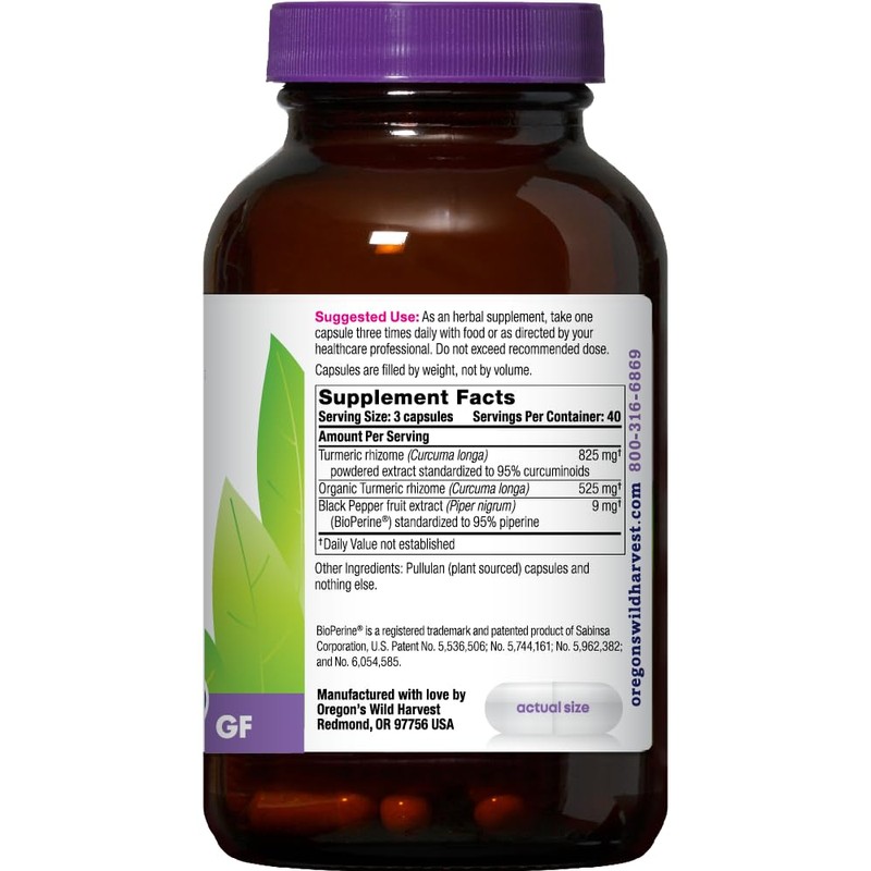 Support your immune system, heart health, and inflammatory response with Oregon's Wild Harvest turmeric capsules. Made with pure, freshly milled organic turmeric and turmeric rhizomes, Oregon's Wild Harvest Turmeric Capsules contain 1350 mgs (per 3 capsules) of verified Non-GMO turmeric standardized to 95% curcumin. Containing BioPerine (standardized to 95% piperine) derived from black pepper fruit extract to ensure maximum absorption, Oregon's Wild Harvest turmeric supplements contain powerful antioxidant properties that can provide protective nutritional support of the cardiovascular system, joints, and liver, as well as natural, anti-inflammatory benefits.Manufactured in Redmond, OR, Oregon's Wild Harvest was proudly founded in 1994 by a registered surgical nurse and farmer with a desire to create natural herbal supplements that give back to the earth through healthy soil, clean water, and the saving of our Non-GMO seeds.Contained in natural bovine gelatin capsules and free of artificial flavors, colors, excipients or stearates, Oregon's Wild Harvest Turmeric Capsules are also gluten-free and dairy-free, contain no wheat, peanuts, soy or corn allergens, and have been product verified Non-GMO by SGS, an independent third-party lab. As an herbal supplement, take three turmeric capsules daily with food, or as directed by your health care professional.