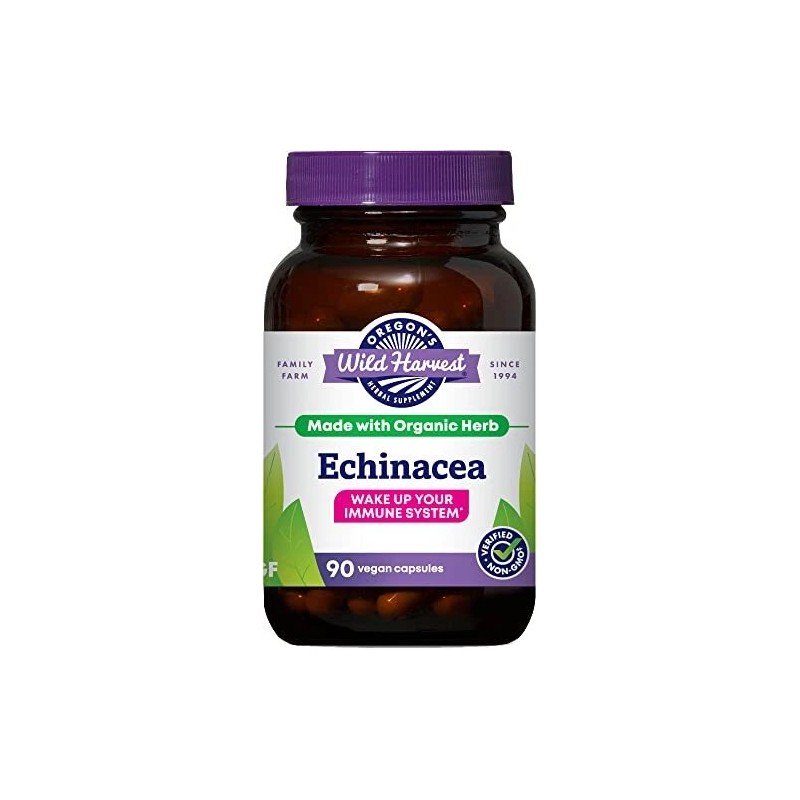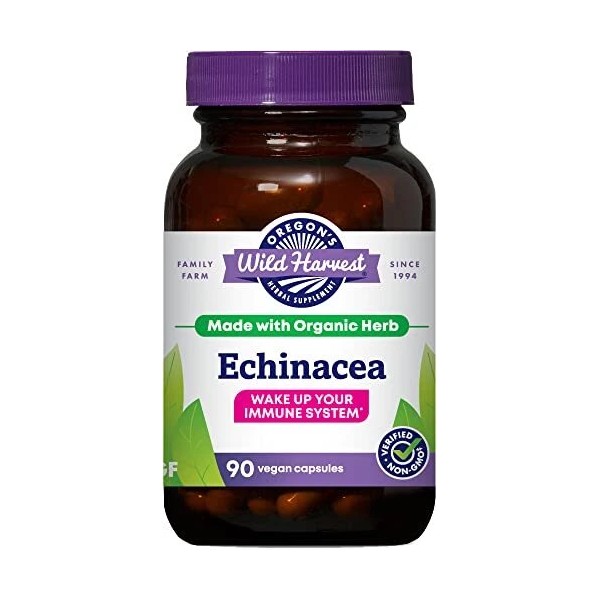 Support your immune system and inflammatory response with Oregon's Wild Harvest Certified Organic Echinacea Capsules. Every dose contains a powerful 800 mg of freshly milled, verified Non-GMO Organic Echinacea tops (Echinacea purpurea), Organic Echinacea root (Echinacea purpurea), and Organic Echinacea root (Echinacea angustifolia) designed to wake up your immune system. Used for centuries to promote natural immune defense, echinacea may provide health benefits including reduced inflammation, improved immunity, and reduced blood sugar.Manufactured in Redmond, OR, Oregon's Wild Harvest was proudly founded in 1994 by a registered surgical nurse and farmer with a desire to create natural herbal supplements that give back to the earth through healthy soil, clean water, and the saving of our Non-GMO seeds.Contained in natural bovine gelatin capsules and free of artificial flavors, colors, excipients, or stearates, Oregon's Wild Harvest Echinacea Capsules are also gluten-free and dairy-free, contain no wheat, peanuts, soy, or corn allergens, and have been product verified Non-GMO by SGS, an independent third-party lab. As an herbal supplement, take two capsules, twice daily or as directed by your health care professional.