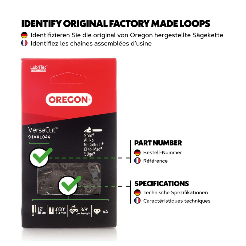 Oregon VersaCut 3/8" Low Profile Pitch, .050" (1.3 mm) Gauge Semi-Chisel Chainsaw Chain for 12 Inch Bar - 44 Drive Links - fits Stihl, Husqvarna, McCulloch, and more (91VXL)