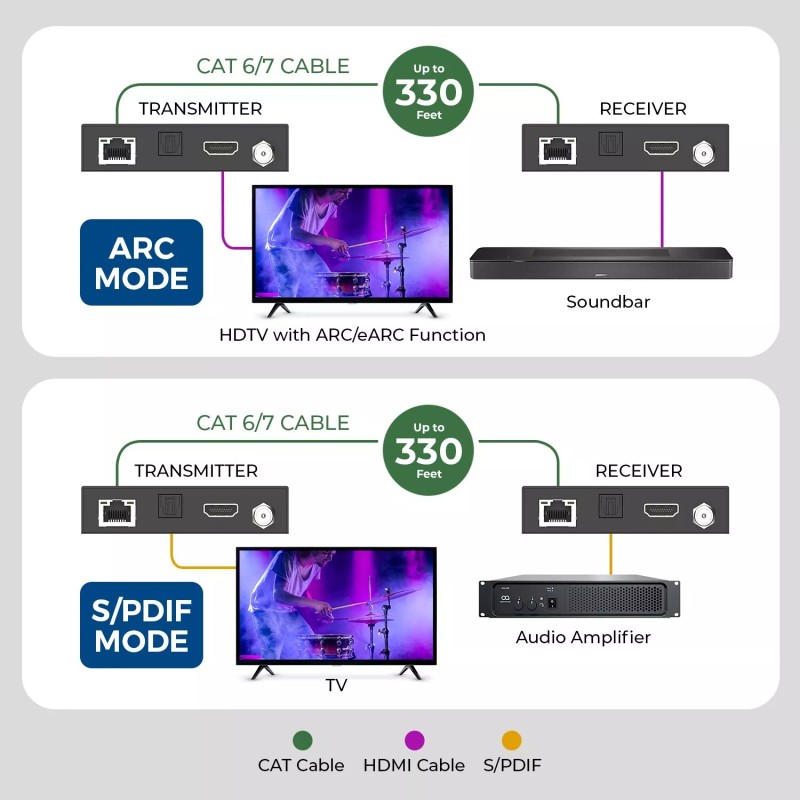 - Extend HDMI ARC/eARC or S/PDIF audio signal up to 100m/~330ft