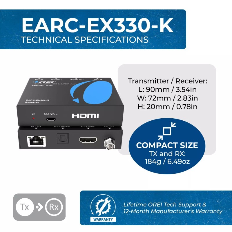 OREI HDMI ARC/eARC & S/PDIF Audio Extender Up To 100m using CAT6/7(EARC-EX330-K)