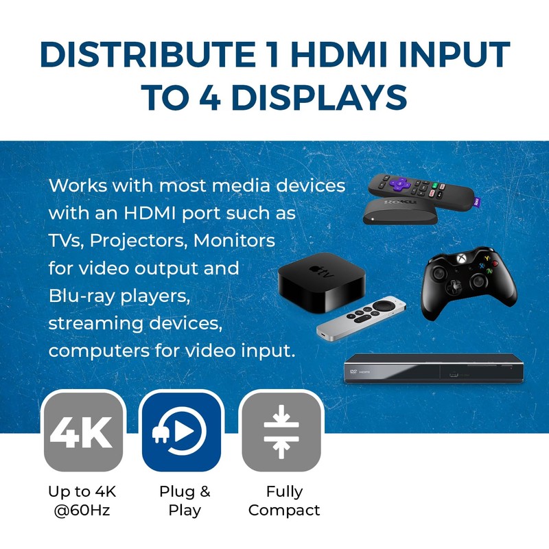 • Resolutions up to 4K x 2K @60Hz, Automatically Scale resolutions to match your TVs. Also supports HDMI 1. 2, 1. 3, 1. 4. We recommend using this splitter with HDMI cables that are 30 feet or shorter and of excellent quality.