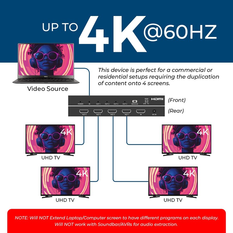 OREI 4K HDMI Splitter 1 in 4 out Duplicate / Mirror 4K Screens w/ Down Scaler...