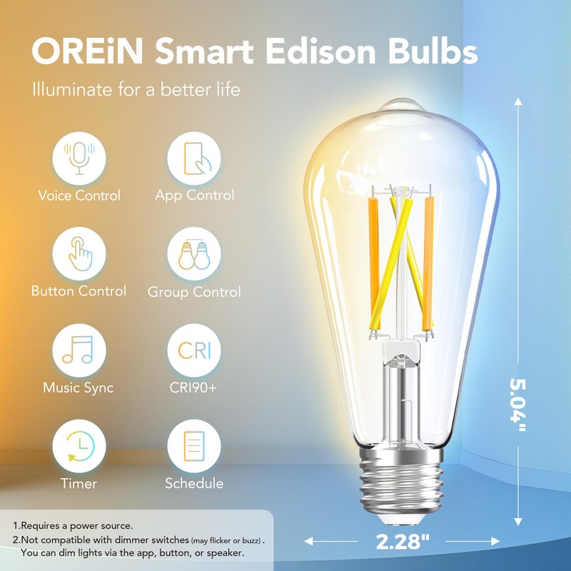 - 【Dimmable & Tunable White】OREiN smart filament bulbs bring 2700k-6500k tunable light with the glass look and modern LED technology. Eamless dimming capabilities (5%-100%) via AiDot APP to suit any mood or decor, such as reading, work relax, night, leisure and more DIY scences you like. No waiting to warm up like CFL bulbs and High CRI of 90+ means brilliant realistic colors.