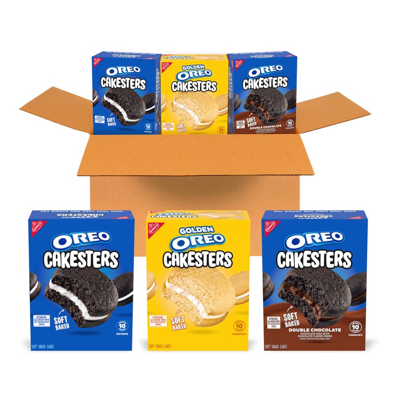 - Three 5-count boxes (15 total 2.02 oz snack packs), each containing two OREO Cakesters Soft Snack Cakes, five snack packs per flavor: Original OREO Cakesters, OREO Golden Cakesters, and OREO Cakesters Double Chocolate