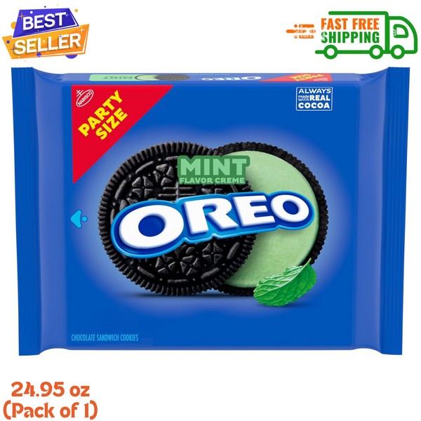 - One 24.95 oz party size pack of OREO Mint Creme Chocolate Sandwich Cookies