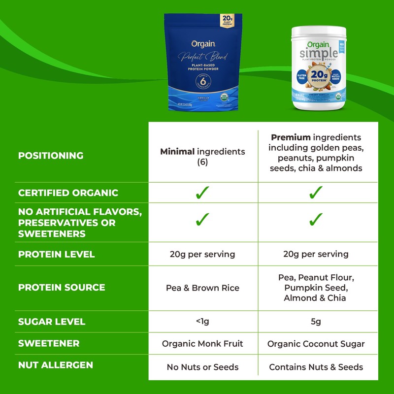 Eating better shouldn't be complicated, but it should always taste amazing. Using our tried-and-true approach of combining thoughtfully selected ingredients to deliver real protein-packed nutrition and an unmatched taste experience, Orgain is proud to launch the latest in good, clean nutrition - Orgain Perfect Blend.?Orgain Perfect Blend is a premium plant-based protein powder crafted from a shortlist of 6 USDA Certified Organic ingredients to deliver 20g* of plant protein and decadent chocolate and luscious vanilla flavors that taste like the real thing, with less than 1g* of sugar and no stevia. No fake flavorsjust incredible tasting nutrition from real foods made by the #1 Plant Protein Powder brand in the US.?Orgain Perfect Blend proves that less truly is more with a list of no's to make any purist giddy: No artificial sweeteners, No artificial flavors, No artificial preservatives, No stevia extract, No sugar alcohols, No Soy ingredients, No Dairy, Non-GMO, and Gluten free. It tastes like real food because it's made from real food. Nature did the hard work. The only thing we added was the label.