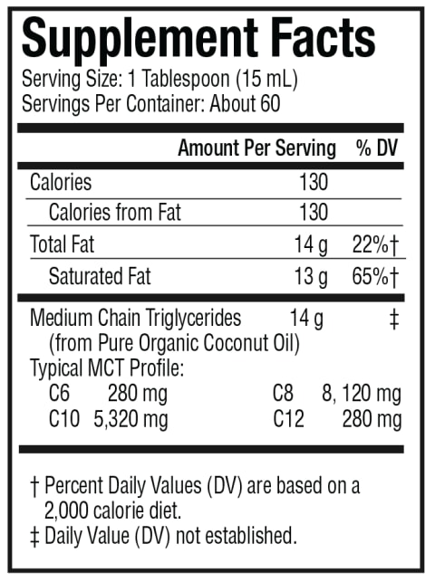 Suggested Usage: Take 1 tablespoon (15 mL) of Organic MCT Oil 1-2 times daily or as directed by a healthcare professional. May be consumed alone or mixed in with your favorite hot or cold beverage.