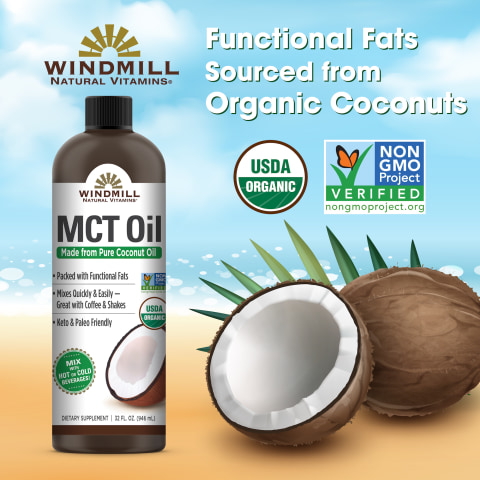 Windmill MCT Oil is certified as USDA Organic and Non-GMO Project Verified, and is made from pure coconuts. Each serving is packed with desirable functional fatty acids known as medium chain triglycerides.