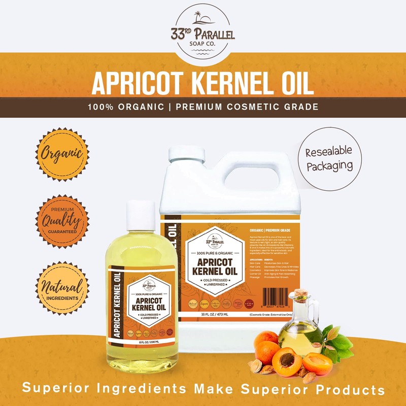- ✅ PREMIUM COSMETIC GRADE & SATISFACTION GUARANTEED - 33rd Parallel Soap Co supplies bulk apricot kernel oil to premium cosmetic brands and we stand behind the purity and quality of every product we sell. Enjoy our high quality RESEALABLE PACKAGING!