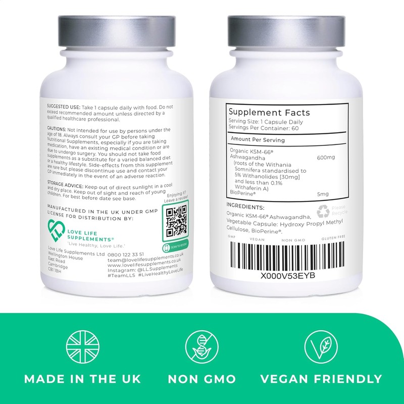 - UK MADE, BRC & GMP CERTIFIED: Love Life Supplements KSM-66 Ashwagandha is proudly manufactured in the United Kingdom. We adhere to the highest quality standards, including BRC (British Retail Consortium) certification and Good Manufacturing Practices (GMP) compliance, ensuring you the best in quality, safety, and efficacy.