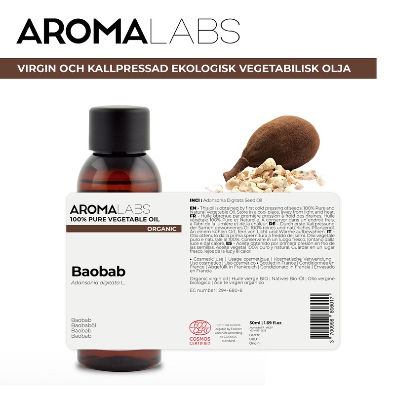 ORGANIC - BAOBAB Oil - 50mL - 100% Pure, Natural, Cold Pressed And Cosmos Certified - AROMA LABS (French Brand)