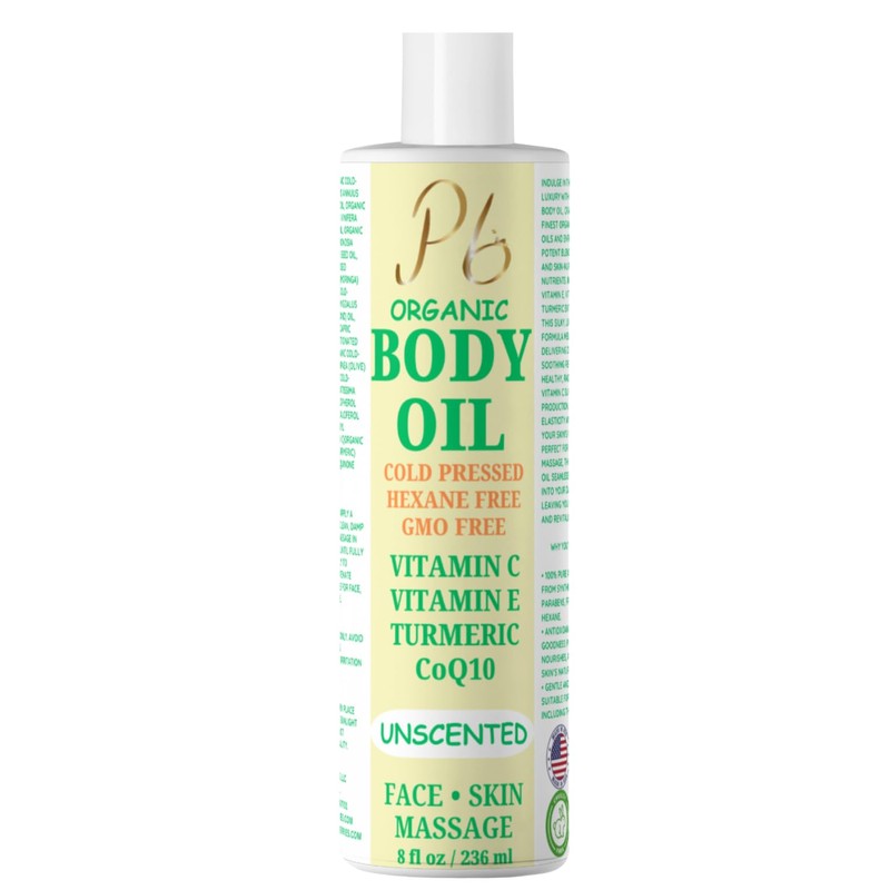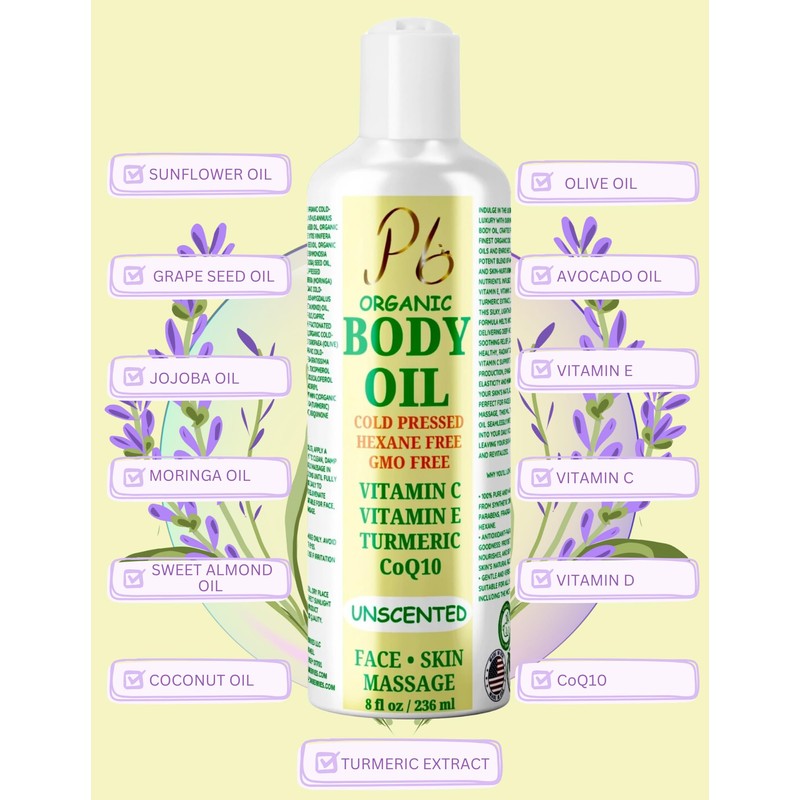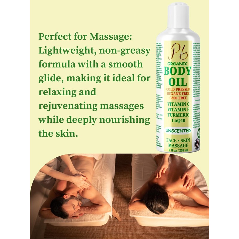 Organic Body Oil - Light, Non-Greasy, Perfect for Massage & Daily Use, with Jojoba, Olive, Moringa, Almond, Turmeric, Vitamin E, C, D & CoQ10 - Natural Moisturizer - 8 fl oz (Unscented)
