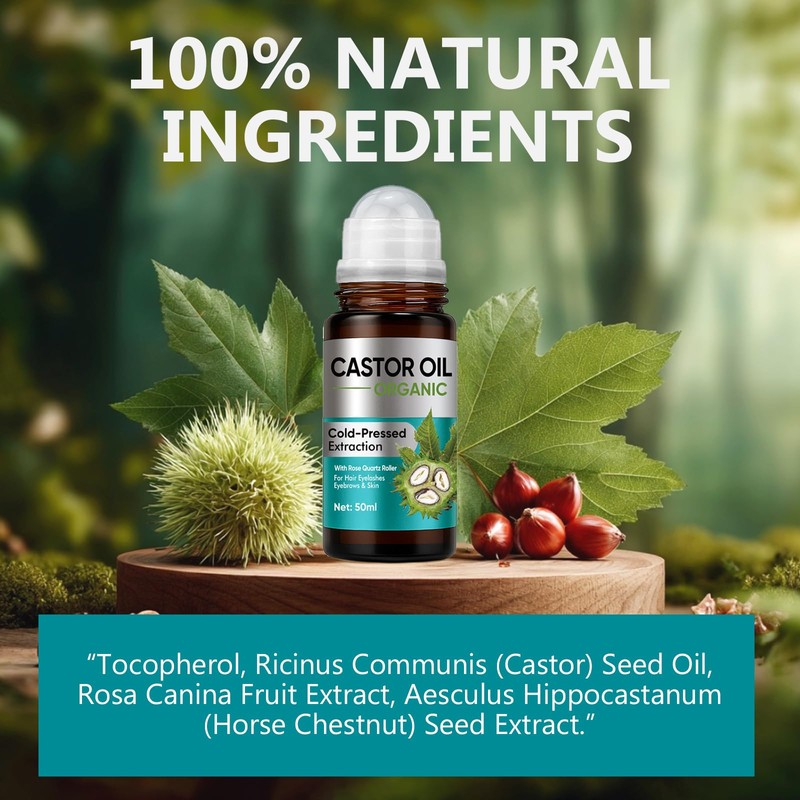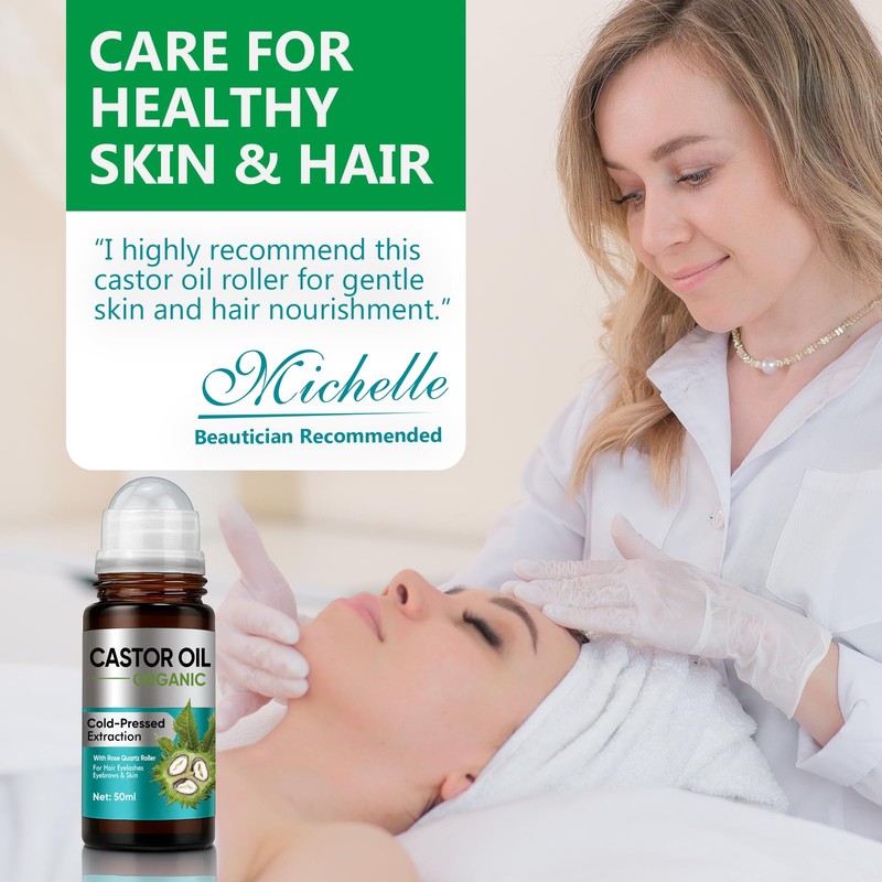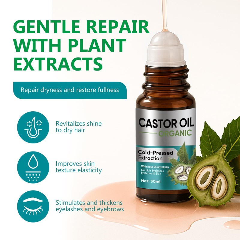 Organic Castor Oil with Rose Quartz Roller, 100% Pure Cold-Pressed & Unrefined Castor Oil Roll On for Hair Growth, Eyelashes, Eyebrows & Skin, Deep Moisture, Soothing(Glass Bottle, Hexane Free)