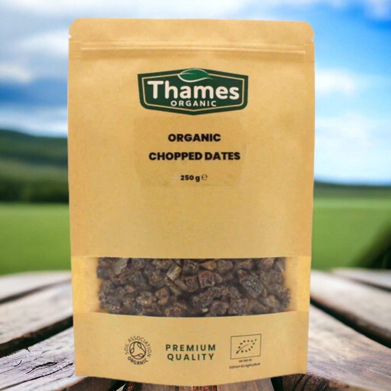 - Thames Organic chopped dates are vegan and GMO-free. They have a sweet and slightly chewy texture, with a rich and caramel-like flavour. They are also a good source of fibre, vitamins, and minerals, making them a nutritious addition to any diet.