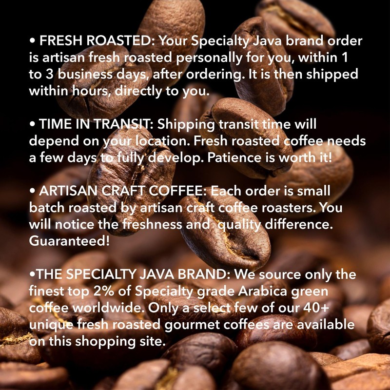 - Fresh roasted: Your Specialty Java order will be queued up and artisanally fresh roasted personally for you, then immediately packaged within just a couple of business days after you place your order.
