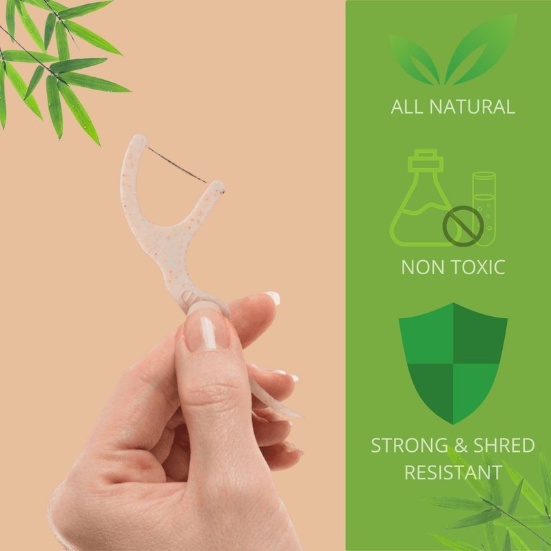 • BIODEGRADABLE DENTAL FLOSS PICKS C Our eco-friendly dental floss picks are completely made from natural materials. The handles of these easy-reach dental floss picks are made from corn starch, which can disintegrate fully when you dispose of, leaving no trace behind, and is a very sustainable dental floss pick option for all the eco-conscious people out there. These natural flossers are great for both kids and adults C VEGAN dental floss picks.