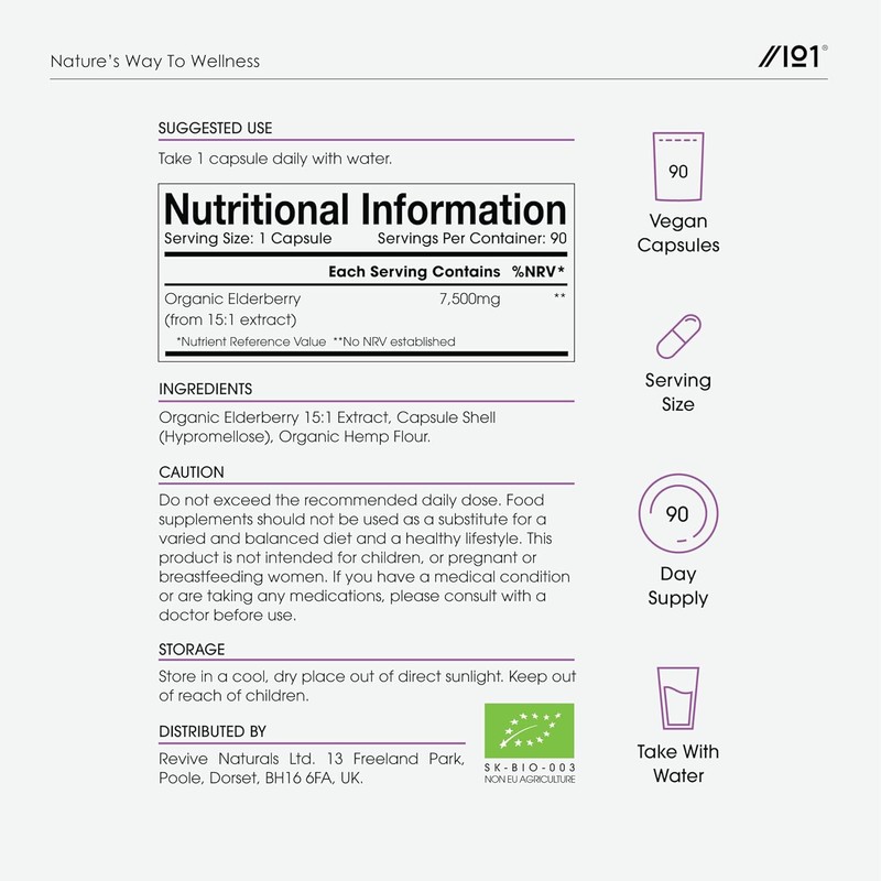 Organic Elderberry 15:1 Extract, Capsule Shell (Hypromellose), Organic Hemp Seed Flour.