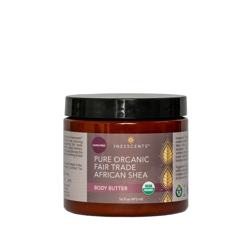 - Inesscents Organic African Shea Butter, made from the karité nut, is obtained from West Africa according to Fair Trade standards. Produced by traditional methods, this gentle and restorative body butter replenishes, protects and deeply hydrates sensitive skin.