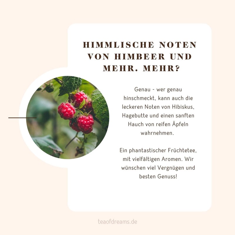- Raspberry and more: Let yourself be enchanted by the heavenly notes of raspberry, hibiscus, rose hip and a gentle touch of ripe apples that meet in this diverse tea blend.