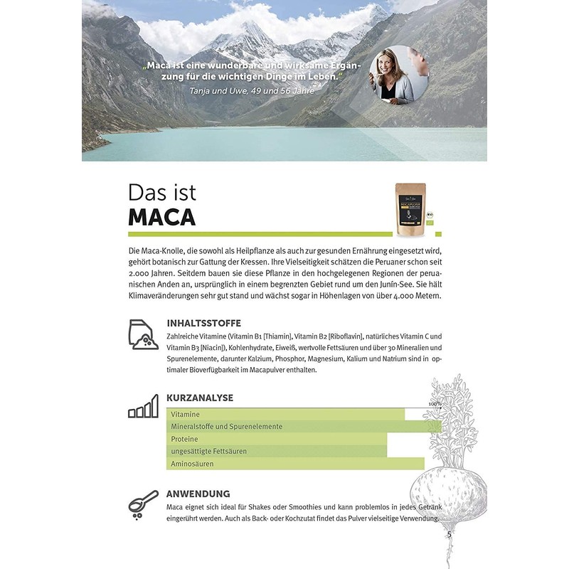 - Easy to use. Also for on the go, at work, during sports or at university. Black maca belongs to the health conscious menu. Simply stir into the smoothie or juice or sprinkle over the cereal.