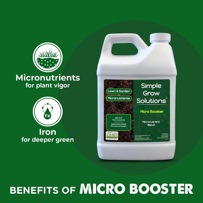 Micro Booster is a blend of the micronutrients Iron, Manganese, and Zinc, enhanced with the secondary macronutrients Sulfur and Magnesium. This concentrated micronutrient formula can be used to deepen the green of your turf or plants and correct micronutrient deficiencies. With immediately available nutrients, this formula was designed to be rapidly absorbed to correct & prevent mineral deficiencies. Use Micro Booster in your lawn, garden, or indoor plants. The features and benefits of Micro Booster Liquid micronutrient supplement: Micronutrients aid in essential functions of turf, trees, flowers, & fruit/veggies, Can encourage greening: vital micronutrients support chlorophyll production, perk up lawn/garden: immediately available nutrients, prevents & corrects micronutrient deficiencies, covers 6,400 square Feet when applying with a hose-end sprayer. Can be used on all grass types, can be used for garden, flowers, trees, & fruits/veggies.