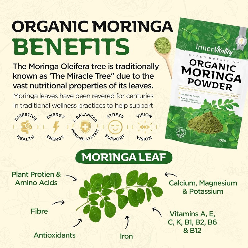 Organic Moringa Powder, 300g Premium UK Certified Organic Pure Moringa Leaf Rich in Essential Vitamins & Minerals by Inner Vitality