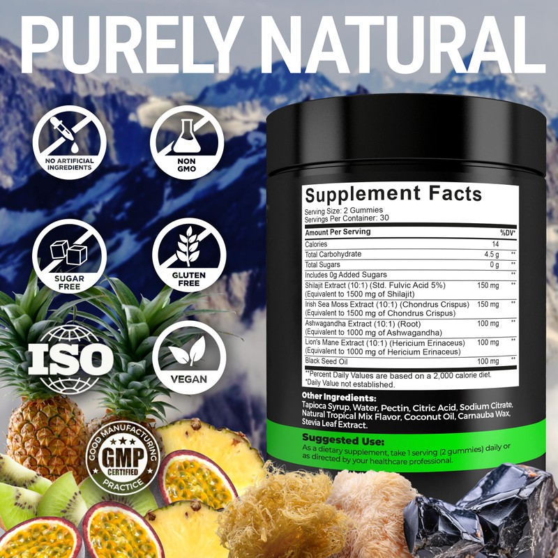 🏆 Take 1 serving (2 gummies) of the shilajit supplement daily. This organic Shilajit with Ashwagandha and Sea Moss gummy is flavored with tropical mix, and is Vegan, Gluten-Free, Sugar-Free, Non-GMO, and Organic. GMP Certified with 30 servings per bottle.